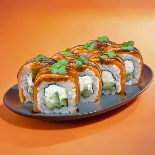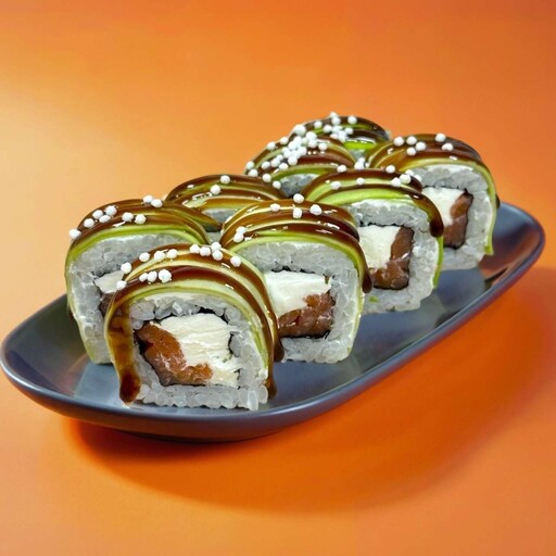 Состав: Рис, нори, авокадо, сливочный сыр, лосось, соус унаги, воздушный рис.