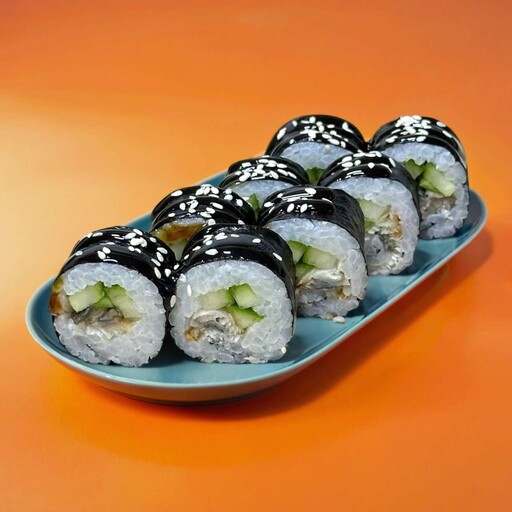 Состав: Рис, нори, угорь, огурец, соус Унаги, кунжут