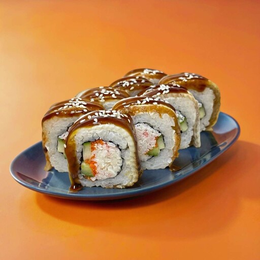 Состав: Рис, нори, угорь, снежный краб, майонез, огурец, масаго, соус унаги, кунжут.