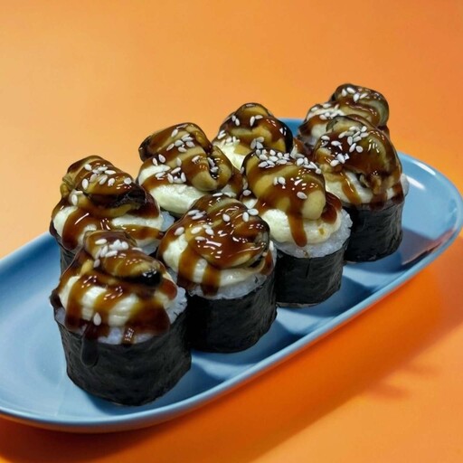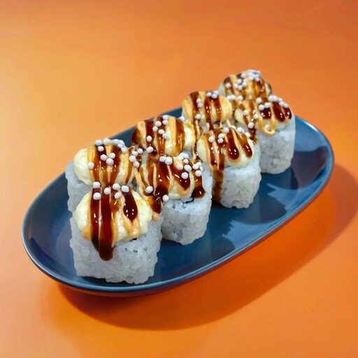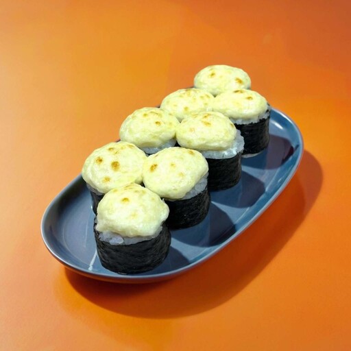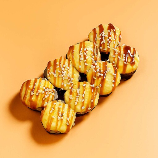 Состав: Рис, нори, тамаго, сливочный сыр, сырная шапочка, мидии, соус терияки, белый кунжут.